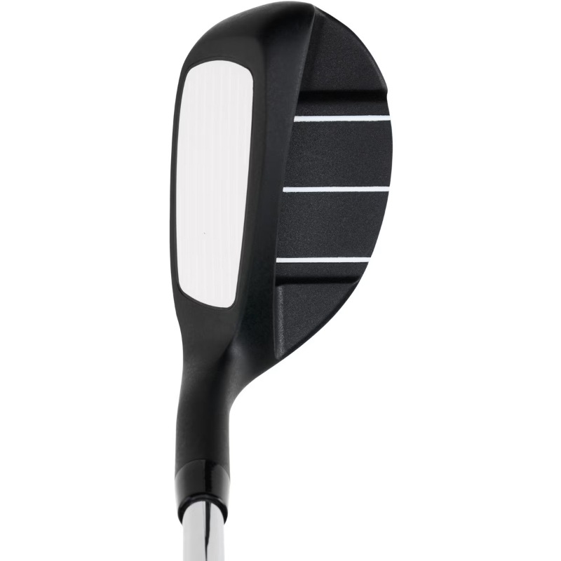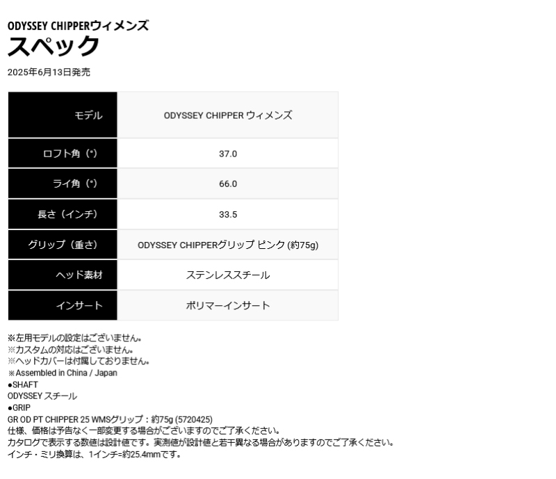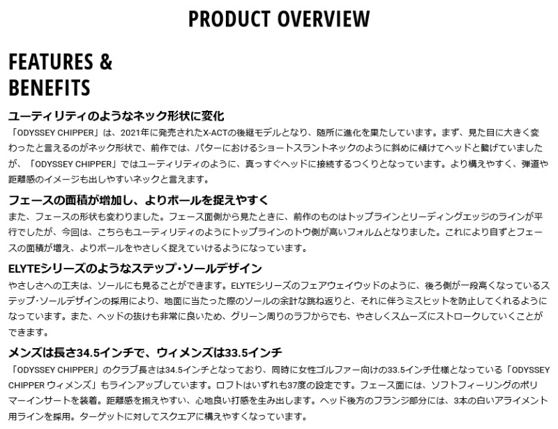 オデッセイの新型お助けクラブはデザインを一新し、やさしさも大幅アップ ■ロフト角(°):37.0 ■ライ角(°):66.0 ■長さ(インチ):33.5 ■グリップ(重さ):ODYSSEY CHIPPERグリップ ピンク (約75g) ■ヘッド素材:ステンレススチール ■インサート:ポリマーインサート ※左用モデルの設定はございません。 ※カスタムの対応はございません。 ※ヘッドカバーは付属しておりません。 ※Assembled in China / Japan ●SHAFT ODYSSEY スチール オデッセイのラインアップに、グリーン周りにおける新たな救世主的存在が加わりました。 2021年に発売されたX-ACTの後継モデルとなる「ODYSSEY CHIPPER」です。 パッティングのようなストロークをするだけで見事なアプローチショットを実現できる、とても重宝するクラブで、名前が変わったことでもわかるように、今回は単なるリニューアルに留まらず、さまざまなところで進化も果たしています。 フェース面やネック形状などを見ると、ユーティリティを思わせるスタイルとなっており、構えやすさやイメージの出しやすさが向上。 新たに採用したELYTEシリーズのフェアウェイウッドのようなステップ・ソールデザインは、ミスへの強さを大きく向上させています。 ロフト37度のヘッドには、ソフトなフィーリングのポリマーインサートを装着。 ラインアップには、長さ34.5インチのメンズ用と、33.5インチの「ODYSSEY CHIPPER ウィメンズ」の2種類を用意しました。 スタッフからのおススメポイント