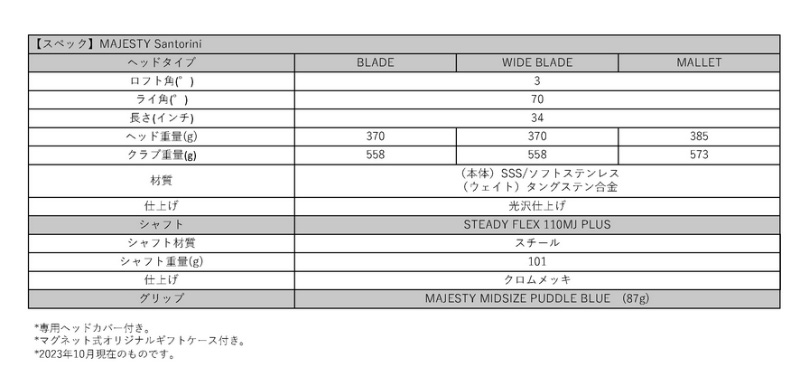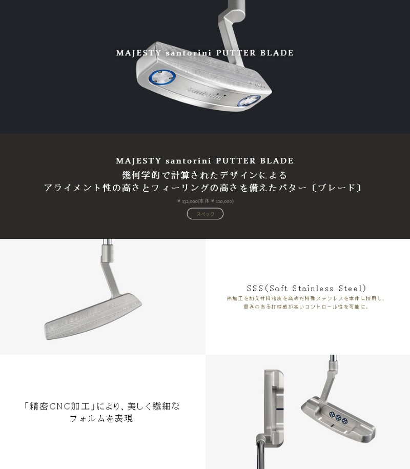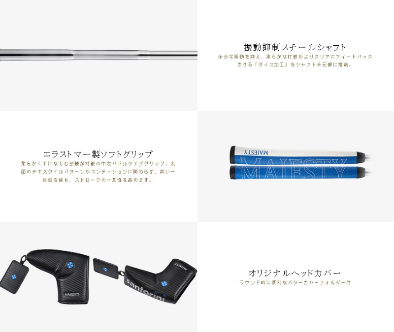 幾何学的で計算されたデザインによる アライメント性の高さとフィーリングの高さを備えたパター〔ブレード〕 素材 (本体)SSS/ソフトステンレス、(ウェイト)タングステン合金 仕上げ 光沢仕上げ ロフト角 3度 ライ角 70度 長さ(インチ) 34 ヘッド重量(g) 370 クラブ重量(g) 558 シャフト STEADY FLEX 110MJ PLUS スチールシャフト(101g) シャフト仕上げ クロムメッキ グリップ MAJESTY MIDSIZE PUDDLE BLUE (85g) 付属品 専用ヘッドカバー、バグネット式オリジナルギフトケース付き ※こちらの商品はお取り寄せとなります。 メーカー欠品、完売等の場合は別途ご連絡いたします。