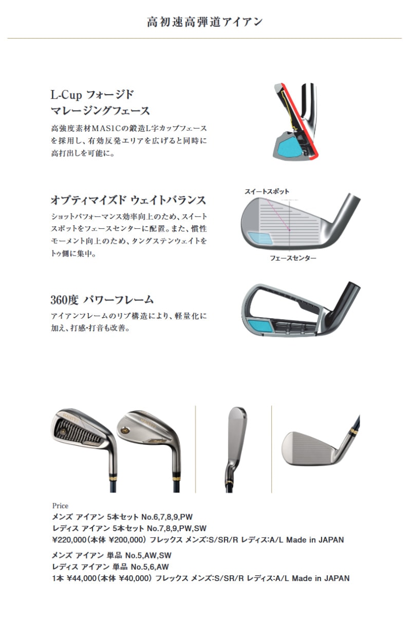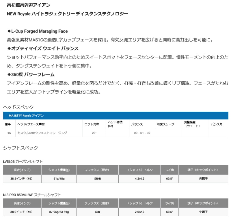 すべてのゴルファーが求める飛距離と徹底的に向き合った結果、今までのロイヤルからデザインや素材、設計などを根本から見直し、”MY FIRST MAJESTY”として、NEW マジェスティ ロイヤルが誕生しました。 今までマジェスティを手にしたことがないゴルファーの方々にもゴルフ人生で最も飛ばせる快感を提供します。 NEWマジェスティロイヤルは目標に対して構えやすいスクエアフェースでありながらも、ショットパフォーマンスはドロー弾道を実現する「スクエアドローシェイプ」を採用。 さらに、フェースにはゴルフクラブ用に専用開発された高級希少素材「ハイペリオン チタン」を使用。 従来のチタン素材より高強度であるため、よりフェースを薄く軽量化することが可能になり、更なる飛距離アップを実現しました。 素材 FACE:タフェストマレージング、BODY:カスタム450 FACE:ソフトマレージング、BODY:カスタム450 製法 FACE:精密鍛造 BODY:精密鋳造 仕上げ/塗装 ハードクロム I.P. ロフト角 I5(20),I6(23),I7(26),I8(31),I9(37),PW(43),AW(49),SW(54) ライ角 I5(60.5),I6(61),I7(61.5),I8(62),I9(62.5),PW(63),AW(63.5),SW(63.5) シャフト N.S.PRO 850MJ WF スチールシャフト(S)中調子 グリップ MJ LT6 35-3(35g/内径D),色入れ:シャンパンゴールド ※こちらの商品はお取り寄せとなります。 メーカー欠品、完売等の場合は別途ご連絡いたします。