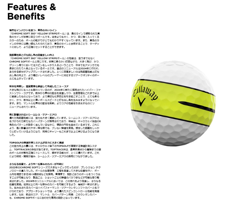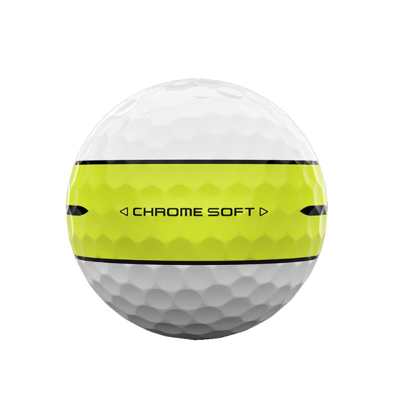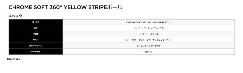 アライメント入りのボールは、店頭においてどんどん存在感を増しており、年々、販売数も増加してきています。 キャロウェイでも、これまでさまざまなタイプのものを採用。 人気を博してきましたが、今回、従来以上に目立つスタイルのものを投入することとなりました。 「CHROME SOFT 360° YELLOW STRIPEボール」という名前のとおり、太く鮮やかな黄色いラインが360度に描かれているため、ボールの転がりは一目瞭然! また、ターゲットに対してボールをセットする際に役立つよう、中央には黒い線も加えられています。 飛距離などの性能は、2024年にリニューアルされたCHROME SOFTボールと同じで、コアなどの素材や空力の見直しにより、「柔らかいのに、飛ぶ」という特性をさらにブラッシュアップ。 ウレタンカバーをより均一な厚みにすることができるようになったことで、グリーン周りでのパフォーマンスも大きく向上しています。 コア:ハイパー・ファストソフト・コア 中間層:ハイスピードマントル カバー:ハイ・パフォーマンス・ツアーウレタンソフトカバー カバーパターン:シームレス・ツアーエアロ ボール構造:3ピース Made in USA ※オウンネームサービスは対応しておりません