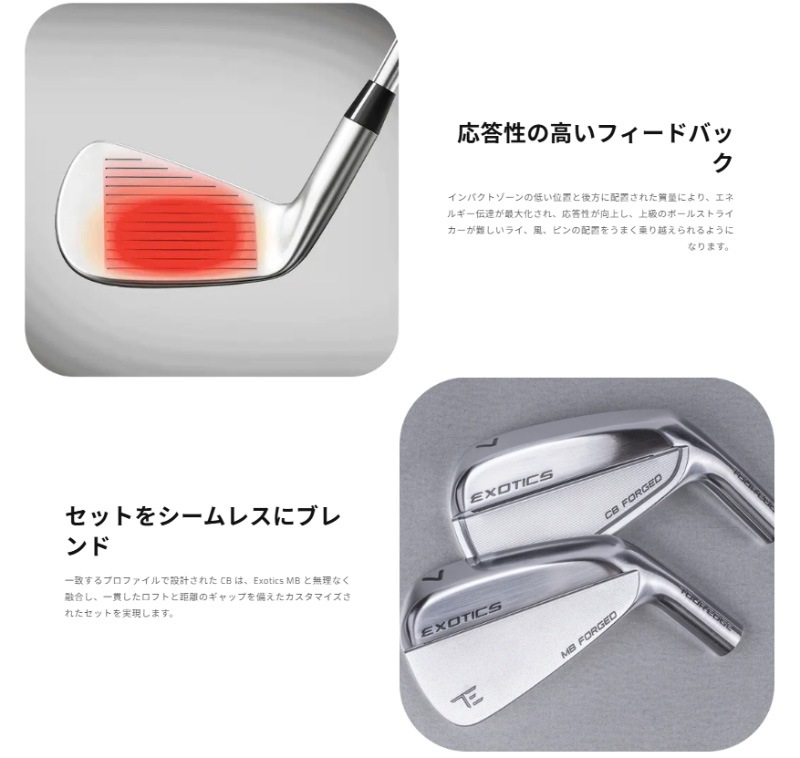※こちらの商品はUS取寄せ品となります。 商品のお届けまで3〜4週間前後となりますので予めご了承ください。 プレイアブルなプレーヤー向けアイアンの登場。ツアーにインスパイアされた全く新しいExotics CBは、エリートストライカーが求める精度と打感を実現し、同クラスのアイアンとは一線を画す高い操作性も兼ね備えています。 ■ロフト角:#5-25°、#6-28°、#7-32°、#8-36°、#9-41°、PW-46° ■ライ角:#5-61°、#6-61.5°、#7-62°、#8-62.5°、#9-63°、PW-63.5° ■グリップ:ゴルフプライド ツアーベルベット 360 ブラック/標準: 50g (60発) | ミッドサイズ: 57.5g (60発) ■製造国:アメリカ ■シャフト・フレックス:ダイナミックゴールド ミッド 100 - スチール(R/S)中高 ・ヘッドが同じモデルのサンプル画像を表示しております。番手・シャフト等につきましては商品スペックをご確認ください。
