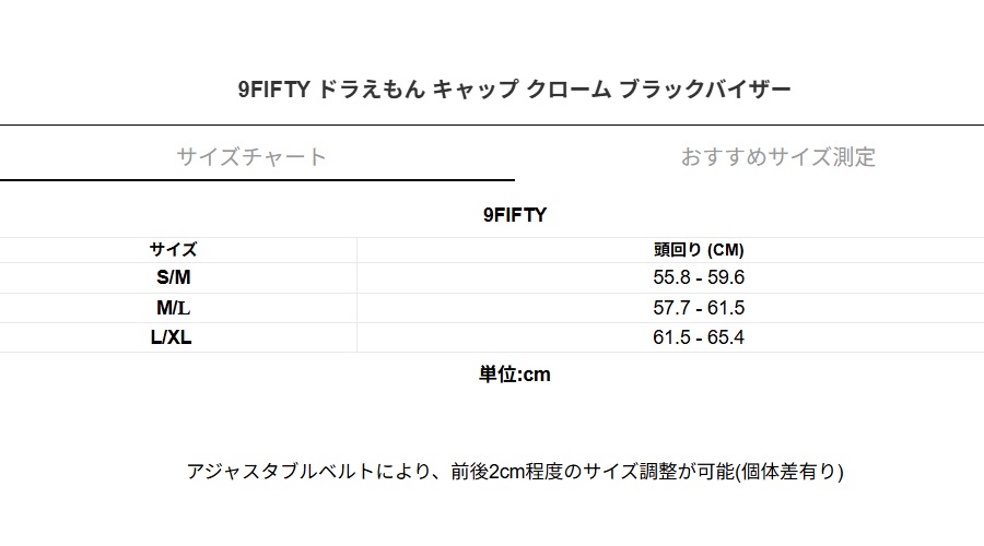 日本を代表する国民的キャラクターであるドラえもんをフィーチャーしたコレクション。 シルエットはアジャスタブル仕様でサイズ調整が可能な9FIFTY。 S/M(約55.8〜59.6cm) M/L(約57.7〜61.5cm) L/XL(約61.5〜65.4cm) 素材:ポリエステル メーカー品番:14935421