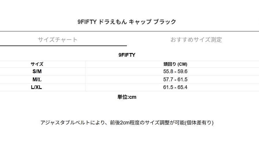 日本を代表する国民的キャラクターであるドラえもんをフィーチャーしたコレクション。 シルエットはアジャスタブル仕様でサイズ調整が可能な9FIFTY。 S/M(約55.8〜59.6cm) M/L(約57.7〜61.5cm) L/XL(約61.5〜65.4cm) 素材:ポリエステル メーカー品番:14935422
