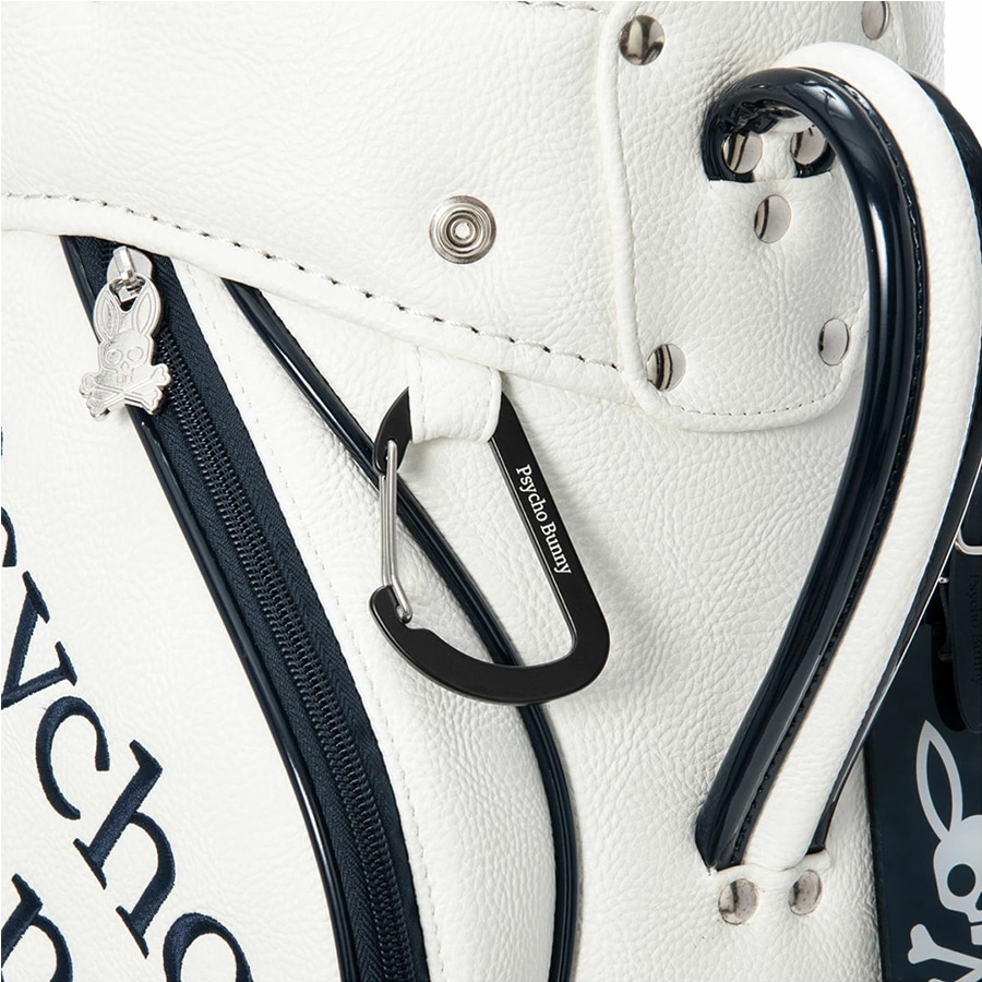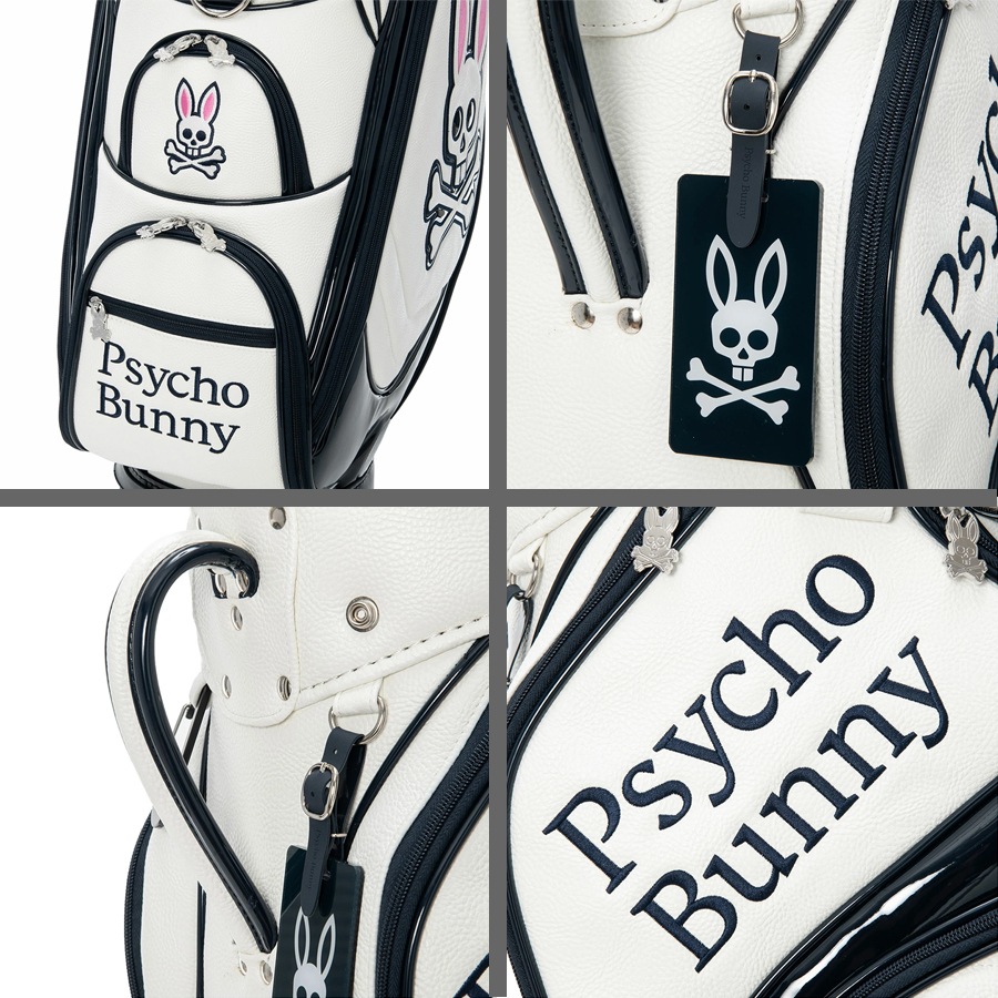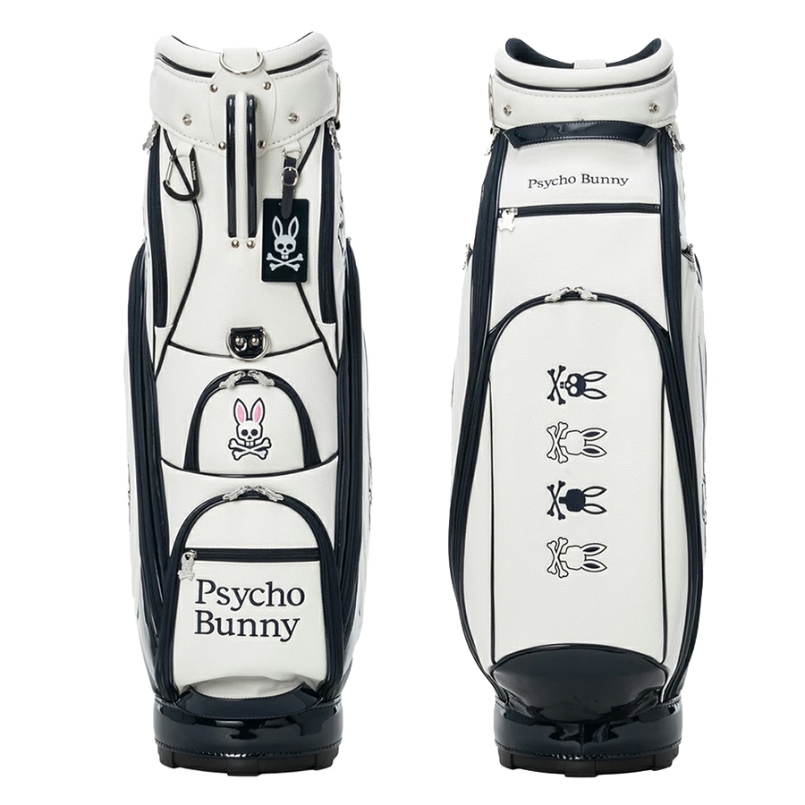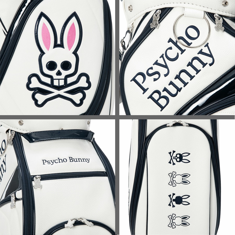 Psycho Bunnyの象徴、「ピンクの耳のスカルバニー」を両サイドに大胆にあしらった今シーズンのトップモデル、キャディバッグ。 高級感あふれるレザーライクな合成皮革を使用。ロゴデザインは全て丁寧に刺繍で施されており、クラス感のある仕上がりを実現しています。 大胆かつシンプルなデザインで長くご愛用いただけます。 ハンドル横には、ポーチやタオル、小物を掛けるのに便利なオリジナルデザインのカラビナを装備しています。 口径:9.0型 クラブ対応長さ:46インチ 仕切分割:5分割 重量:4.8kg クラブ収納数:14本 ネームプレート素材:アクリル 素材:合成皮革(PU) ※ネームプレート刻印サービスは対応しておりません Psycho Bunny