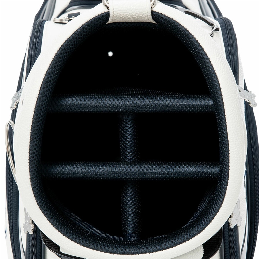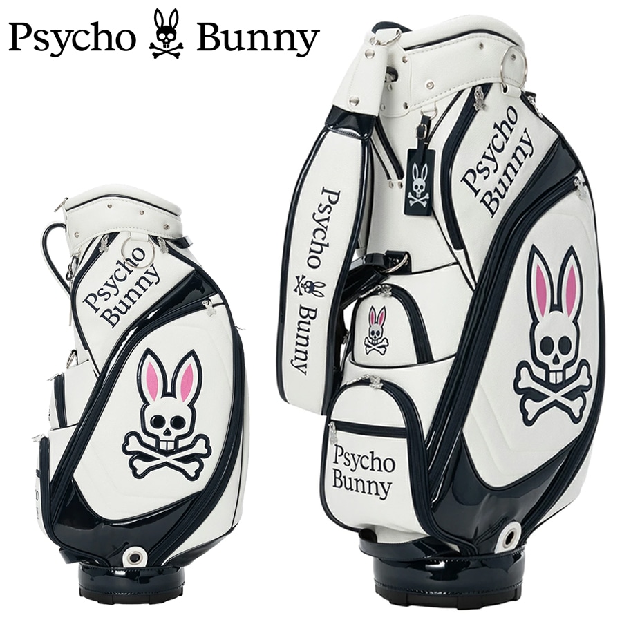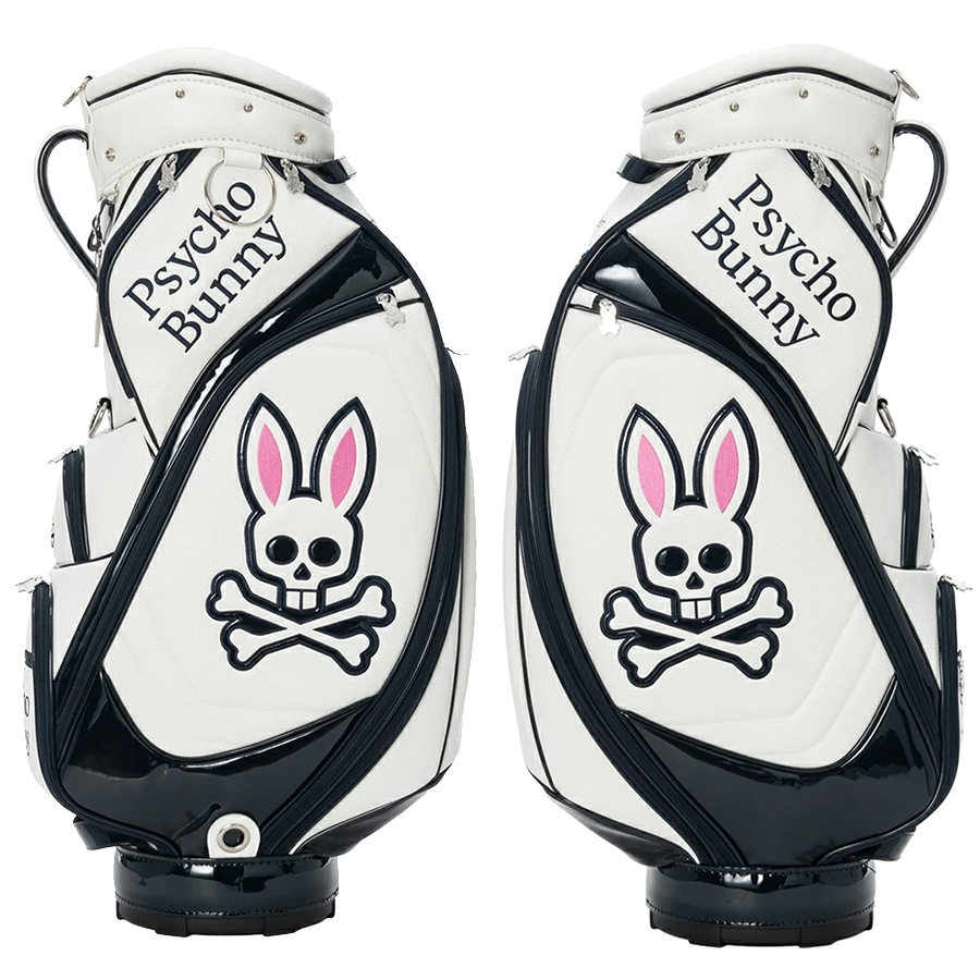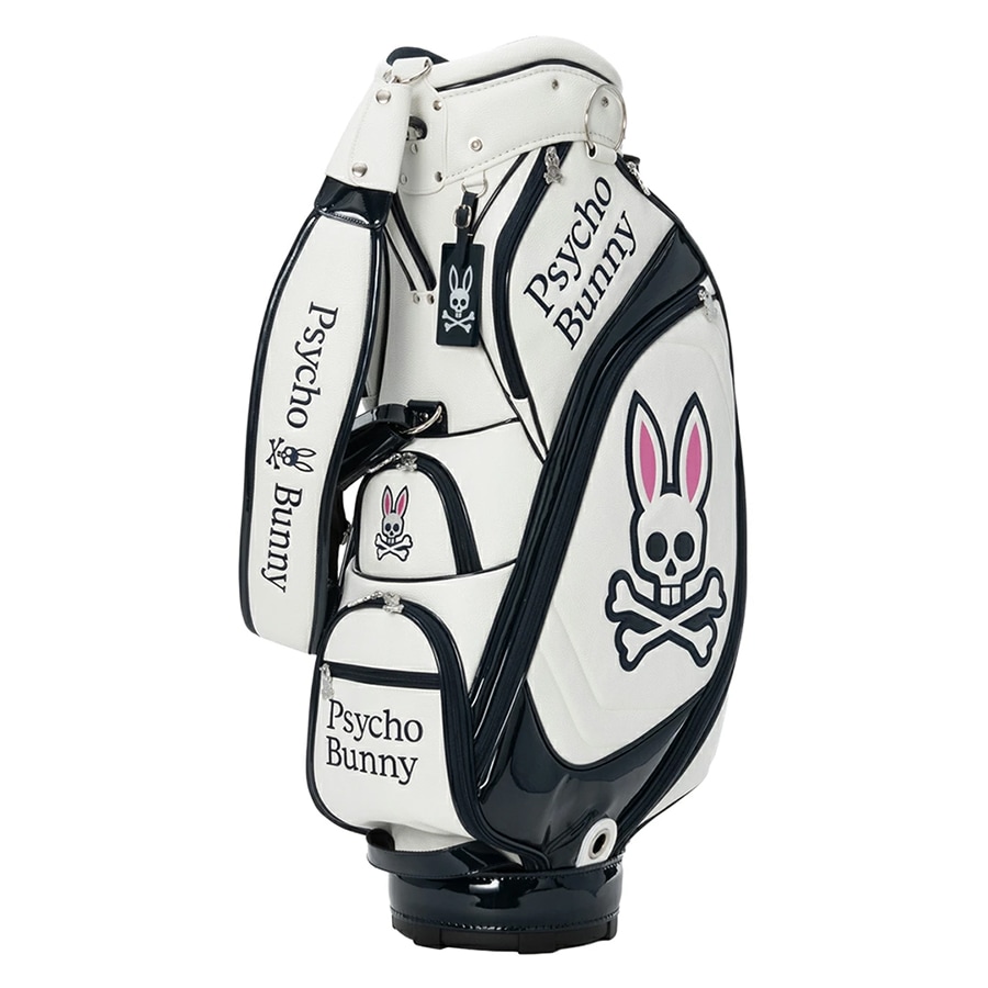 Psycho Bunnyの象徴、「ピンクの耳のスカルバニー」を両サイドに大胆にあしらった今シーズンのトップモデル、キャディバッグ。 高級感あふれるレザーライクな合成皮革を使用。ロゴデザインは全て丁寧に刺繍で施されており、クラス感のある仕上がりを実現しています。 大胆かつシンプルなデザインで長くご愛用いただけます。 ハンドル横には、ポーチやタオル、小物を掛けるのに便利なオリジナルデザインのカラビナを装備しています。 口径:9.0型 クラブ対応長さ:46インチ 仕切分割:5分割 重量:4.8kg クラブ収納数:14本 ネームプレート素材:アクリル 素材:合成皮革(PU) ※ネームプレート刻印サービスは対応しておりません Psycho Bunny