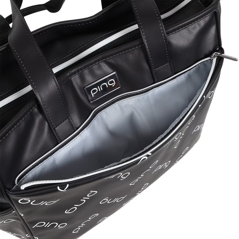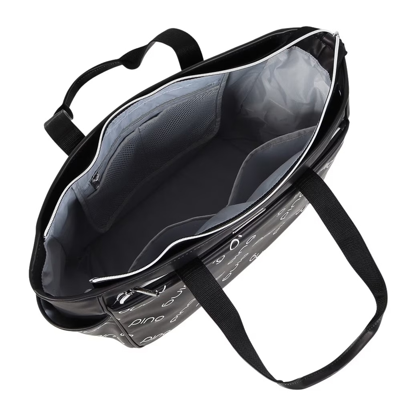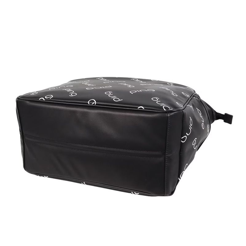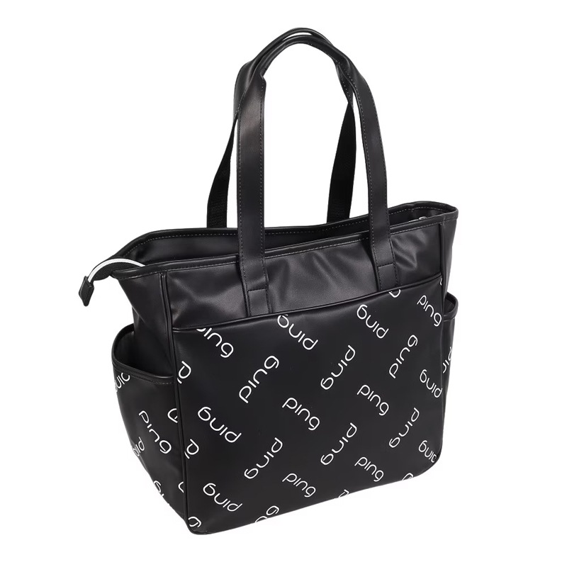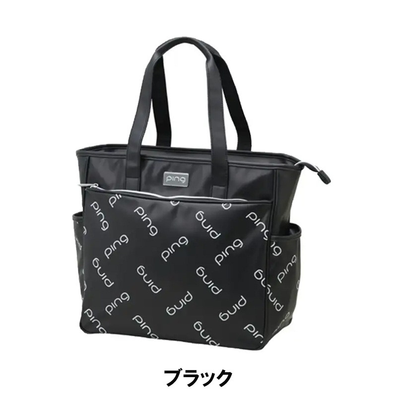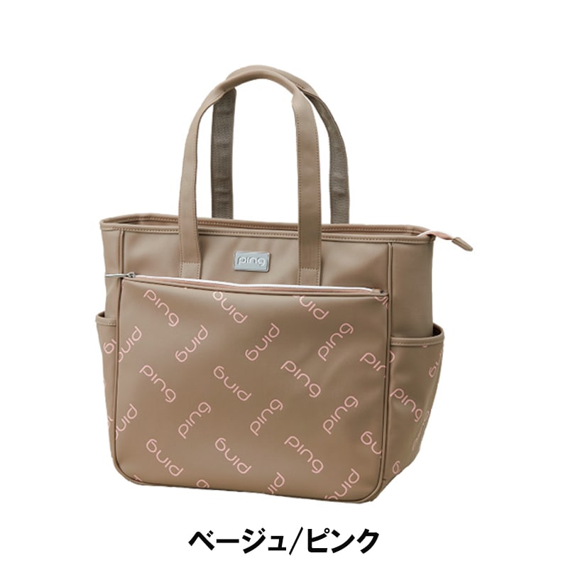 ・pingロゴモノグラムが入った高級感のあるデザインと素材を採用 ・アウター前面にZIP付きポケット1か所とサイドに差し込みポケット2か所、インナーには吊りポケットと差し込みポケット ・底を折りたたんで収納できる仕様 ・肩掛け可能なトートタイプ ・女性らしいシルバーチャームロゴ付き