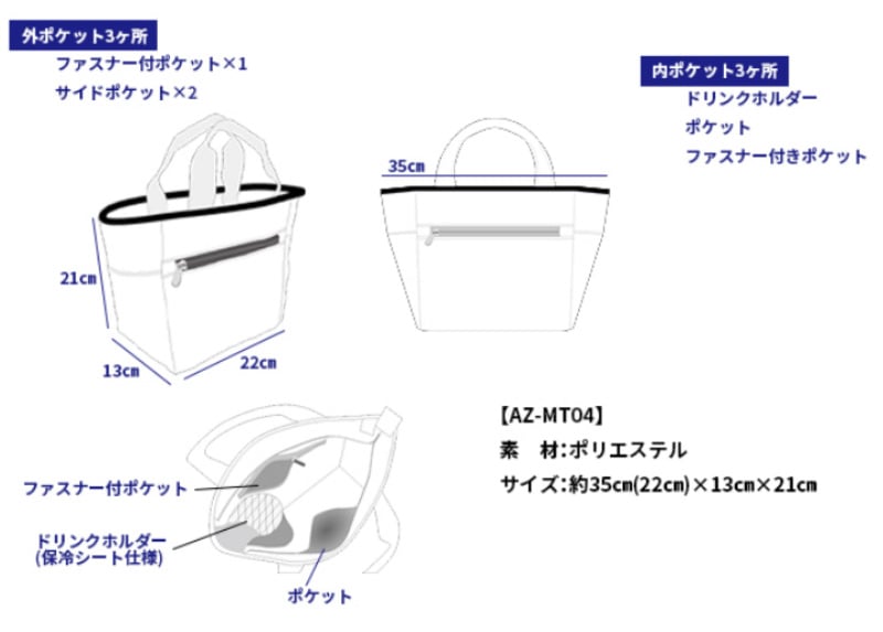 豊富なデザインから選べるラウンド用ミニトート。 スマホや小物、ペットボトルも縦に収納可能。 ■サイズ:W(上/下)35/22×H21×D13cm ■素材:ポリエステル ■製造国:中国 スタッフからのおススメポイント