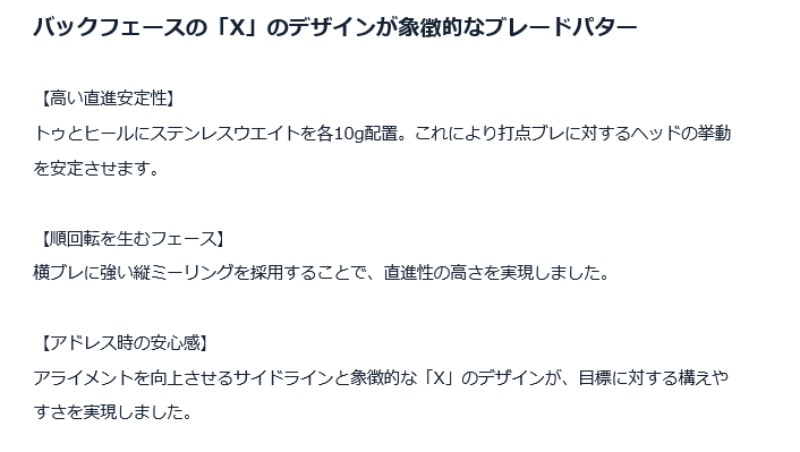 ゴルファーの 『感性』 を刺激するパター バックフェースの「X」のデザインが象徴的なブレードパター 【高い直進安定性】 トゥとヒールにステンレスウエイトを各10g配置。これにより打点ブレに対するヘッドの挙動を安定させます。 【順回転を生むフェース】 横ブレに強い縦ミーリングを採用することで、直進性の高さを実現しました。 【アドレス時の安心感】 アライメントを向上させるサイドラインと象徴的な「X」のデザインが、目標に対する構えやすさを実現しました。 ■ヘッド形状:ブレード型 ■ロフト角:3.0 ■ヘッド素材/製法:SUS303 / 鍛造 CNC削り出し ■ライ角:70 ■シャフト:オリジナルカーボン (made in SAKATA) ■グリップ:GR SAKATA LAB CN PUTTER X (BK) ■総重量(g):約535 ■日本製 ※受注生産品のため、メーカー発注後のキャンセルは出来ません。 予めご確認の上ご注文ください。 スタッフからのおススメポイント