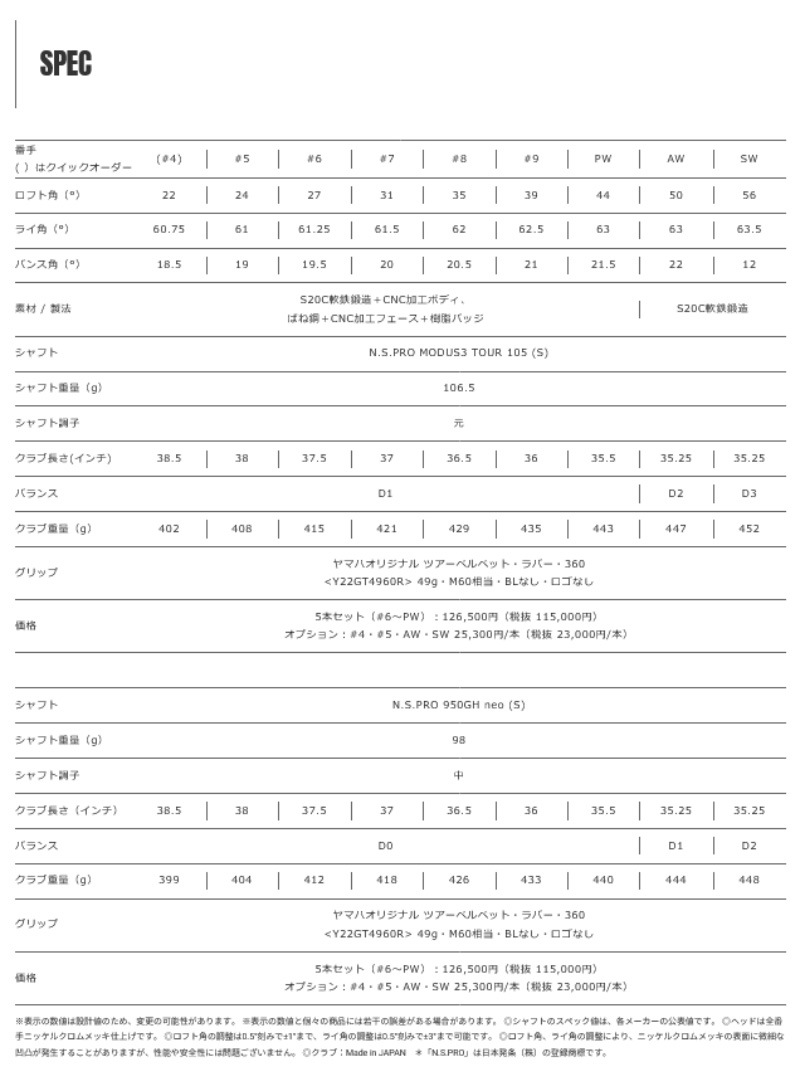 ※発売日以降順次発送となります。 打感、飛距離性能、寛容性の良さを兼ね備えた軟鉄アイアン。 軟鉄鍛造ボディと残響音を制御する樹脂バッジの採用により、軟鉄特有のやわらかい打感と手ごたえをダイレクトに感じ取れる。 ターゲットゴルファーのスイング解析と実打テストによって生み出したソール形状、バンス形状が最適化された抜けが良く、刺さりにくく、跳ねにくい「V字ソール」を搭載。 ■ヘッド素材:ボディ:S20C軟鉄/フェース:ばね鋼+樹脂バッジ ■ヘッド製法:ボディ:鍛造+CNC加工/フェース:CNC加工 ■仕上げ・メッキ:ニッケルクロム仕上げ ■製造国:日本 ■ロフト:#6(27),#7(31),#8(35),#9(39),PW(44) ■ライ角:#6(61.25),#7(61.5),#8(62),#9(62.5),PW(63) ■シャフト:N.S.PRO 950GH neo スチールシャフト(S) 中調子 ■グリップ:ヤマハオリジナル ツアーベルベット・ラバー・360<Y22GT4960R>(49g/M60相当/バックライン無し/ロゴ無し)
