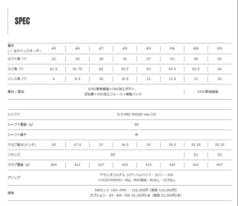 ※発売日以降順次発送となります。 複合モデル並みのやさしさを備えたセミラージサイズの軟鉄アイアン。 軟鉄鍛造ボディと残響音を制御する樹脂バッジの採用により、軟鉄特有のやわらかい打感と手ごたえをダイレクトに感じ取れる。 ターゲットゴルファーのスイング解析と実打テストによって生み出したソール形状、バンス形状が最適化された抜けが良く、刺さりにくく、跳ねにくい「V字ソール」を搭載。 ■ヘッド素材:【#5】ボディ:S20C軟鉄/フェース:ばね鋼+樹脂バッジ【AW・SW】S20C軟鉄 ■ヘッド製法:【#5】ボディ:鍛造+CNC加工/フェース:CNC加工【AW・SW】鍛造 ■仕上げ・メッキ:ニッケルクロム仕上げ ■製造国:日本 ■ロフト:#6(25),#7(28),#8(32),#9(37),PW(43) ■ライ角:#6(61.75),#7(62),#8(62.5),#9(63),PW(63.5) ■シャフト:TENSEI GR i50 カーボンシャフト(SR/R) 中調子 ■グリップ:ヤマハオリジナル ツアーベルベット・ラバー・360<Y22GT4560R>(45g/M60相当/バックライン無し/ロゴ無し)